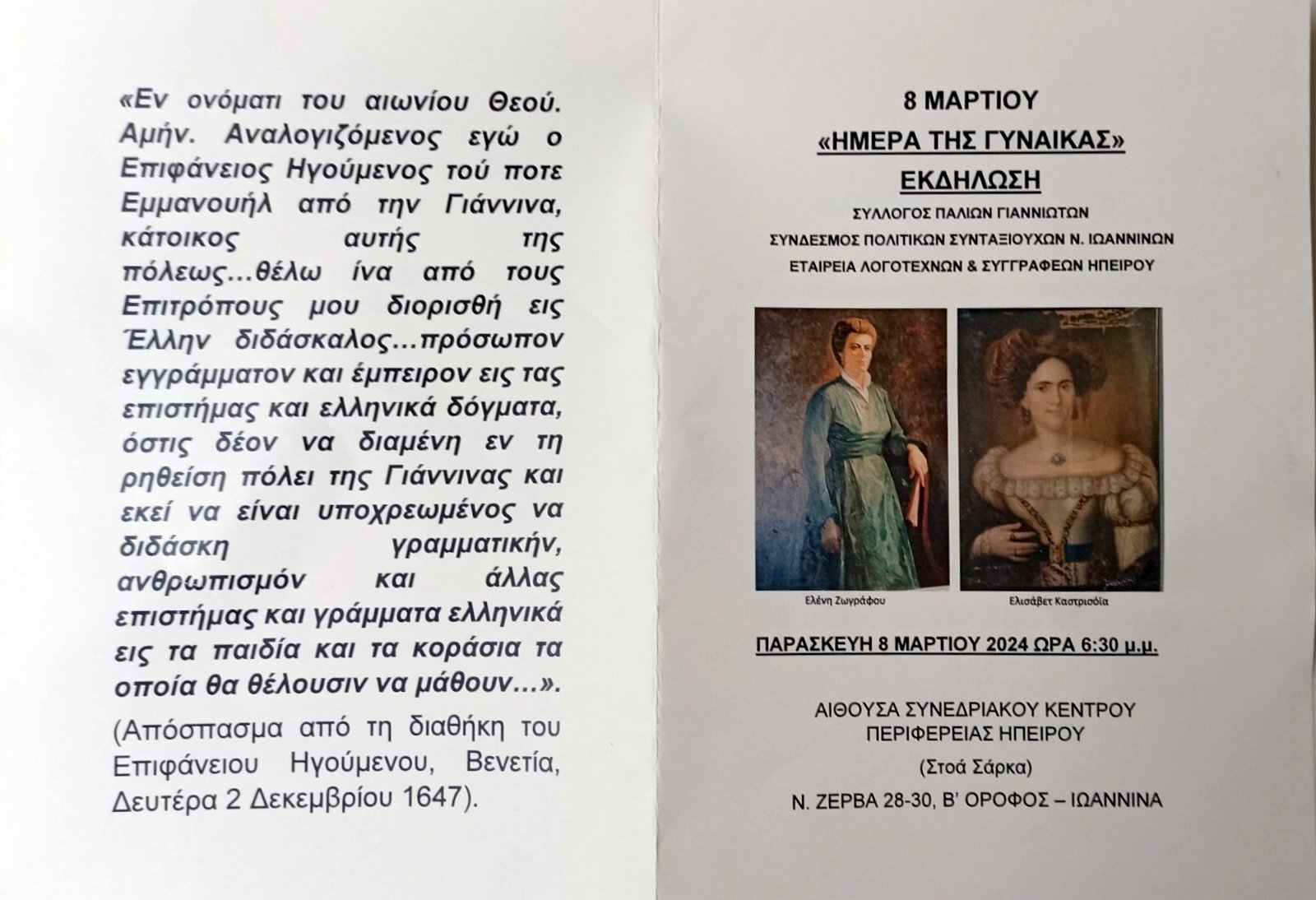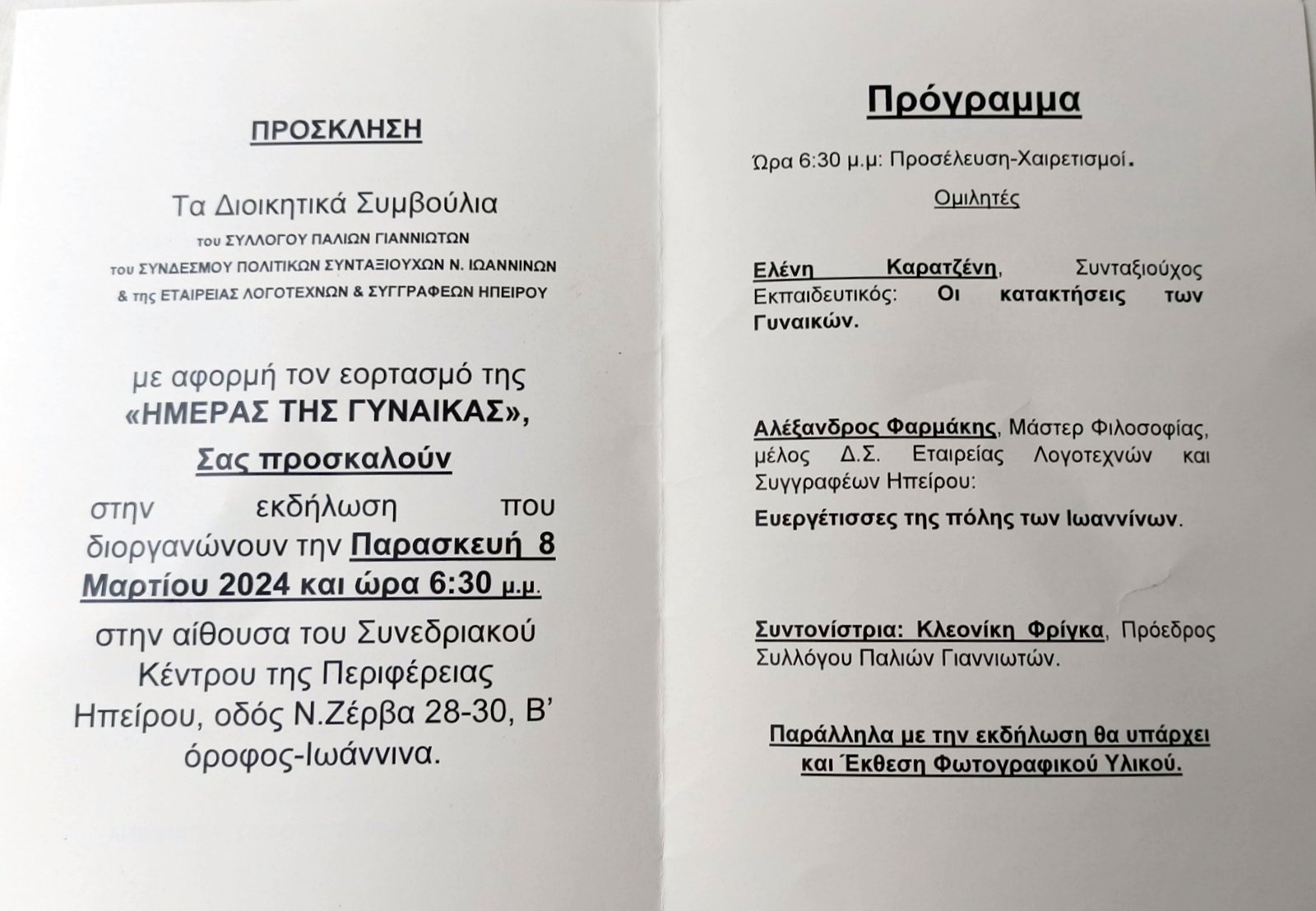με αφορμή τον εορτασμό της «ΗΜΕΡΑΣ ΤΗΣ ΓΥΝΑΙΚΑΣ», σας προσκαλούν στην εκδήλωση που διοργανώνουν την Παρασκευή 8 Μαρτίου 2024 και ώρα 6:30 μ.μ. στην αίθουσα του Συνεδριακού Κέντρου της Περιφέρειας Ηπείρου (Στοά Σάρκα) οδός Ν. Ζέρβα 28-30, Β’ όροφος-Ιωάννινα.